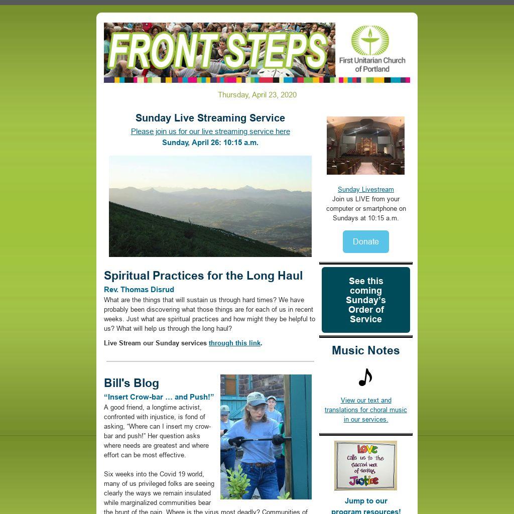 If you have an item you’d like published in our weekly Front Steps (eNews) or the Sunday Bulletin, please submit it here and include in the subject line “For eNews” –or– “For Sunday Bulletin” –or– “For eNews and Sunday Bulletin.”