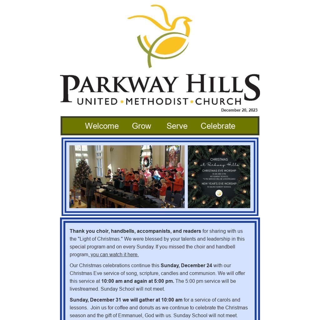 We hope worship at Parkway Hills this Advent and Christmas season aids you in reflecting on the gift of Emmanuel, God with us, and we look forward to our continued worship together.