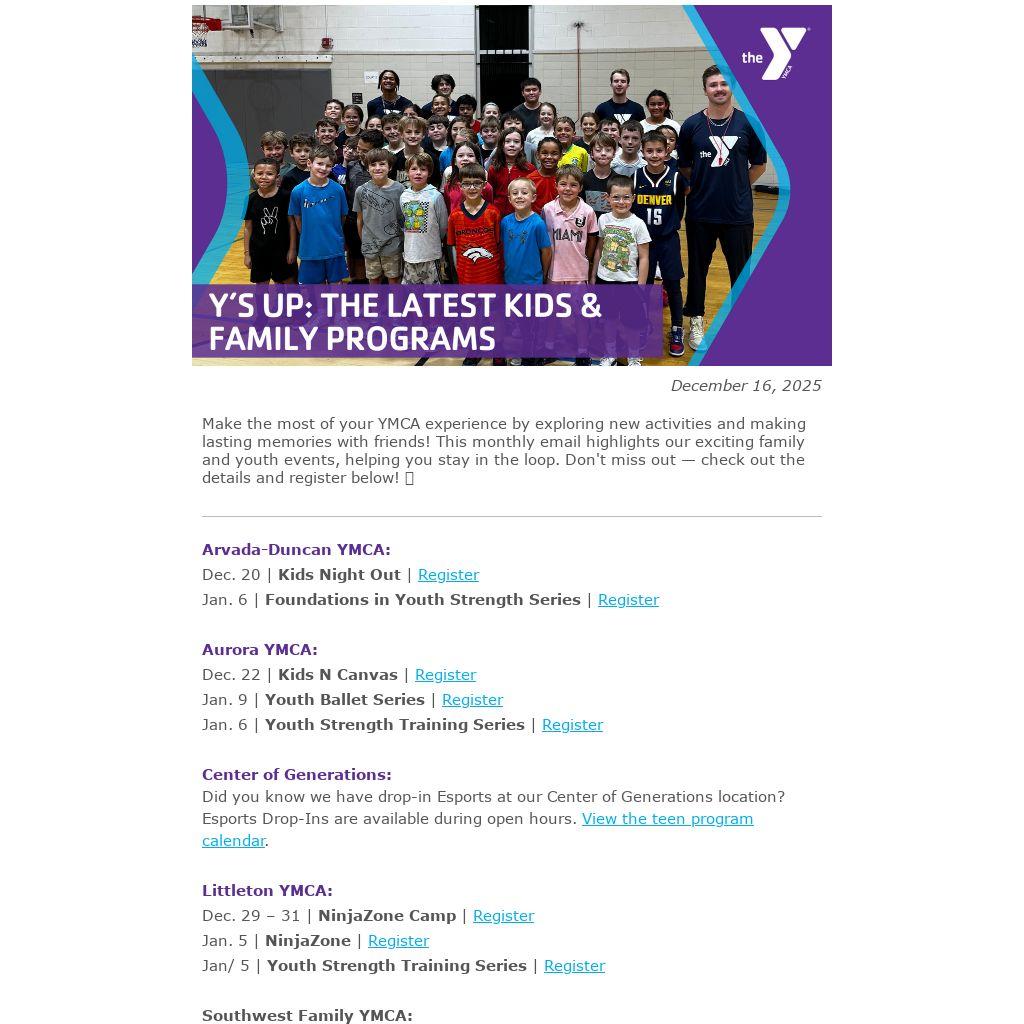 Make the most of your YMCA experience by exploring new activities and making lasting memories with friends! This monthly email highlights our exciting family and youth events, helping you stay in the loop. Don't miss out — check out the details and register below! 👇