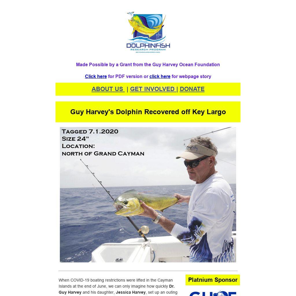 When COVID-19 boating restrictions were lifted in the Cayman Islands at the end of June, we can only imagine how quickly Dr. Guy Harvey and his daughter, Jessica Harvey, set up an outing to get offshore. As luck would have it, one of the two dolphin they tagged north of Grand Cayman during one of their first offshore trips of the summer, on July 1st, would go on to provide direct evidence of the time it takes a dolphin to swim from Grand Cayman to Key Largo, FL; 38 days. Guy and Jess measured the fish to be 24" in fork length, and Captain Lazaro Rangel measured 28" in fork length when he and his family recaptured the fish aboard Lady C on birds