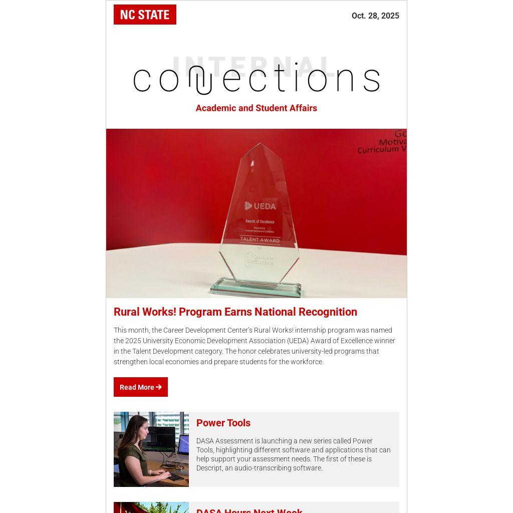 This month, the Career Development Center’s Rural Works! internship program was named the 2025 University Economic Development Association (UEDA) Award of Excellence winner in the Talent Development category. The honor celebrates university-led programs that strengthen local economies and prepare students for the workforce.