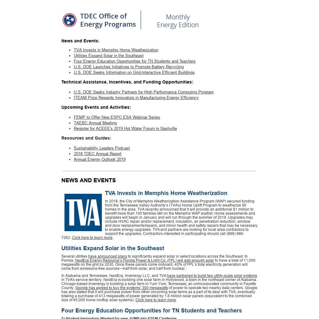 1) Student Innovators Wanted for new JUMP into STEM Challenge Jointly hosted by Oak Ridge National Laboratory (ORNL) and the National Renewable Energy Laboratory (NREL), JUMP into STEM is an online community that motivates students to engage in science, technology, engineering, and mathematics (STEM) field research and innovation. JUMP into STEM recently opened a competition for undergraduate and graduate students who are studying architecture, engineering, computer science, or other buildings-related disciplines. The current competition, “Pushing the Envelope,” challenges participants to design a wall retrofit solution for a single-family home, updating the residence to conform to the 2015 International Energy Conservation Code (IECC). Winning stuTVA dents and/or teams from each competition will participate in a Grand Finale event at NREL in Golden, Colorado this spring, contending for as many as six, 10-week paid internships at ORNL or NREL in the summer of 2019. Applications are due on Friday, February 8, 2019. 2) Tennessee State Parks Conservancy Offering Field Trip Grants for K-8 Students K-8 teachers can apply for a 2019 field trip grant to visit one of 56 Tennessee State Parks locations. Funding covers transportation, lunches/snacks, and related project supplies. Grants are competitive and not all applications will be funded. To apply, submit an application to Sarah.Green@tn.gov or send to “Tennessee State Parks Conservancy, Attn: Field Trip Fund, P.O. Box 190640, Nashville, TN 37219” by February 15, 2019. 3) ARC/ORNL Summer Science Academy Accepting Student Applications The Appalachian Regional Commission (ARC) has partnered with ORNL to host the 2019 Summer STEM Program, a hands-on learning experience for high school and middle school students, as well as high school teachers in STEM-related fields. Many participants come from economically distressed counties and often gain their first exposure to applied science and STEM education through this experience. Participants receive an all-expenses-paid learning residence at ORNL. Selected students will conduct guided group science, math, and computer technology research projects. Selected teachers will work with science practitioners to develop STEM-related curriculum. All Tennessee applications must be submitted in a fillable PDF format, not printed and scanned, and emailed to Logan.McCoy@tn.gov and Lindsay.Gainous@tn.gov by March 12, 2019. Click here to learn more. 4) OEP Accepting Applications for K-12 Energy Education Camps and Workshops Across TN TDEC OEP plans to conduct three Energy Education Camps for K-12 Educators in 2019. The Camps are comprised of three-day training sessions and provide energy-related lesson plans and resources designed for use in the K-12 classroom. These lessons promote energy literacy as it relates to STEM subjects and introduce educators to topics including, but not limited to, electricity generation, consumption, and measurement; renewable energy; and energy efficiency and conservation. 2019 Camps will be hosted at the following dates/locations: - June 18-20: Cumberland Mountain State Park