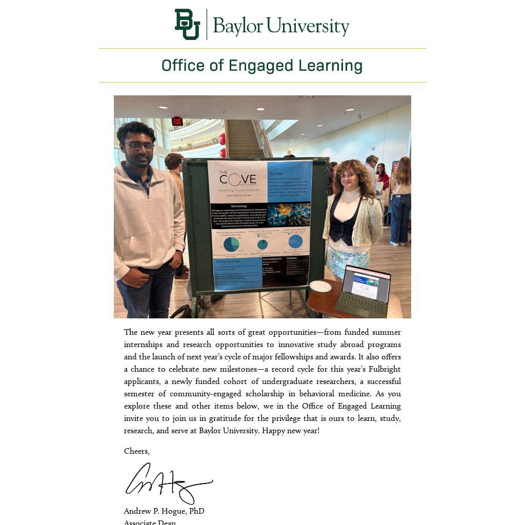 The new year presents all sorts of great opportunities—from funded summer internships and research opportunities to innovative study abroad programs and the launch of next year’s cycle of major fellowships and awards. It also offers a chance to celebrate new milestones—a record cycle for this year’s Fulbright applicants, a newly funded cohort of undergraduate researchers, a successful semester of community-engaged scholarship in behavioral medicine. As you explore these and other items below, we in the Office of Engaged Learning invite you to join us in gratitude for the privilege that is ours to learn, study, research, and serve at Baylor University. Happy new year!