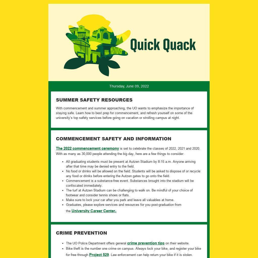 With commencement and summer approaching, the UO wants to emphasize the importance of staying safe. Learn how to best prep for commencement, and refresh yourself on some of the university’s top safety services before going on vacation or strolling campus at night.