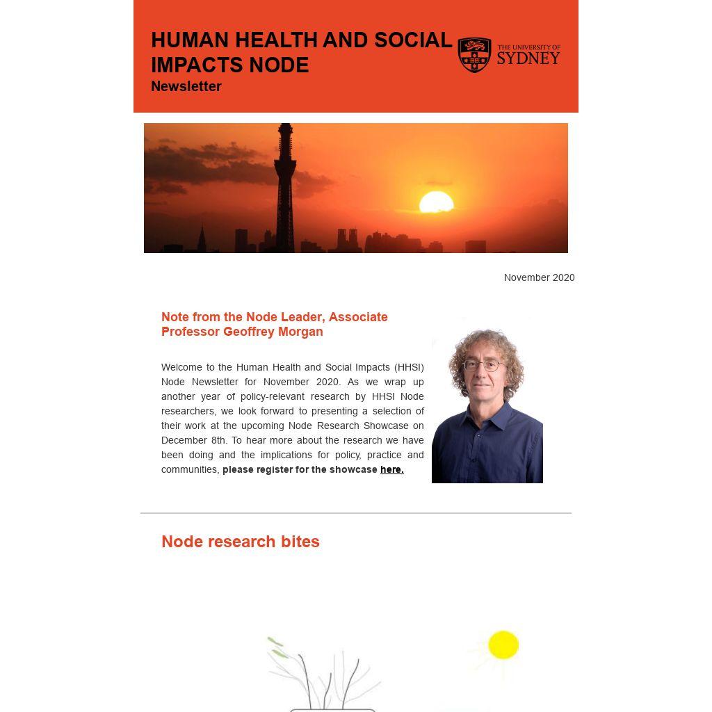 Welcome to the Human Health and Social Impacts (HHSI) Node Newsletter for November 2020. As we wrap up another year of policy-relevant research by HHSI Node researchers, we look forward to presenting a selection of their work at the upcoming Node Research Showcase on December 8th. To hear more about the research we have been doing and the implications for policy, practice and communities, please register for the showcase here.