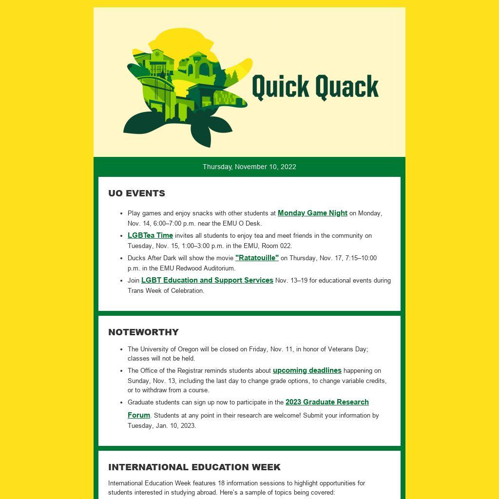 The University of Oregon will be closed on Friday, Nov. 11, in honor of Veterans Day; classes will not be held.