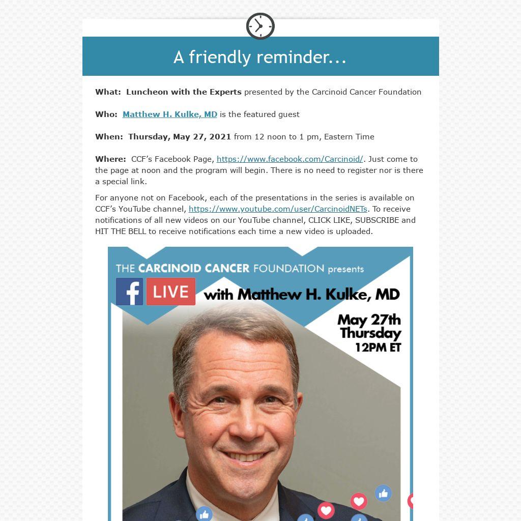 For anyone not on Facebook, each of the presentations in the series is available on CCF’s YouTube channel, https://www.youtube.com/user/CarcinoidNETs. To receive notifications of all new videos on our YouTube channel, CLICK LIKE, SUBSCRIBE and HIT THE BELL to receive notifications each time a new video is uploaded.