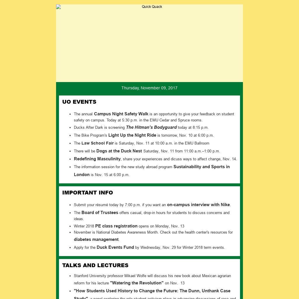 The annualCampus Night Safety Walk is an opportunity to give your feedback on student safety on campus. Today at 5:30 p.m. in the EMU Cedar and Spruce rooms.