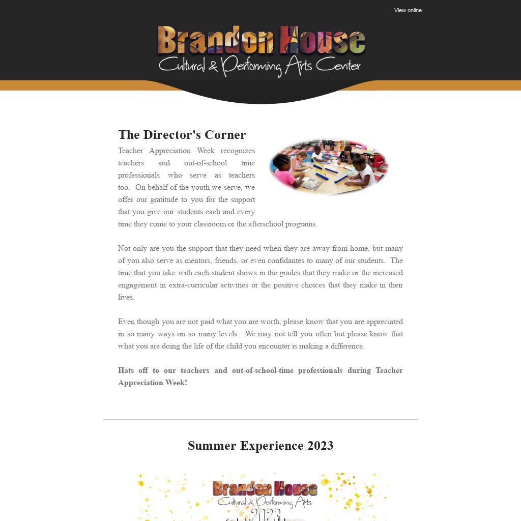 Brandon House's 2023 Summer Programs are FREE and will offer youth every opportunity to be engaged in music, art, and dance. Summer programming begins Monday, June 5, and will end on August 10. Brandon House will serve breakfast and lunch during the summer and programs will offer creative arts activities for every student.