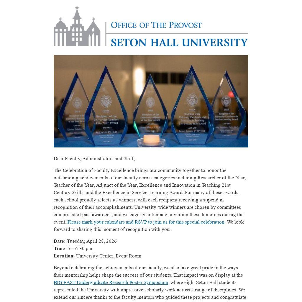 The Celebration of Faculty Excellence brings our community together to honor the outstanding achievements of our faculty across categories including Researcher of the Year, Teacher of the Year, Adjunct of the Year, Excellence and Innovation in Teaching 21st Century Skills, and the Excellence in Service-Learning Award. For many of these awards, each school proudly selects its winners, with each recipient receiving a stipend in recognition of their accomplishments. University-wide winners are chosen by committees comprised of past awardees, and we eagerly anticipate unveiling these honorees during the event. Please mark your calendars and RSVP to join us for this special celebration. We look forward to sharing this moment of recognition with you.