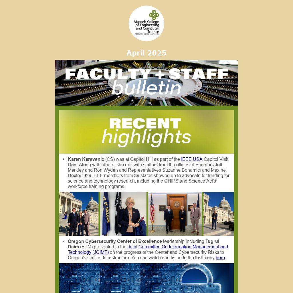 Karen Karavanic (CS) was at Capitol Hill as part of the IEEE USA Capitol Visit Day. Along with others, she met with staffers from the offices of Senators Jeff Merkley and Ron Wyden and Representatives Suzanne Bonamici and Maxine Dexter. 329 IEEE members from 39 states showed up to advocate for funding for science and technology research, including the CHIPS and Science Act's workforce training programs.