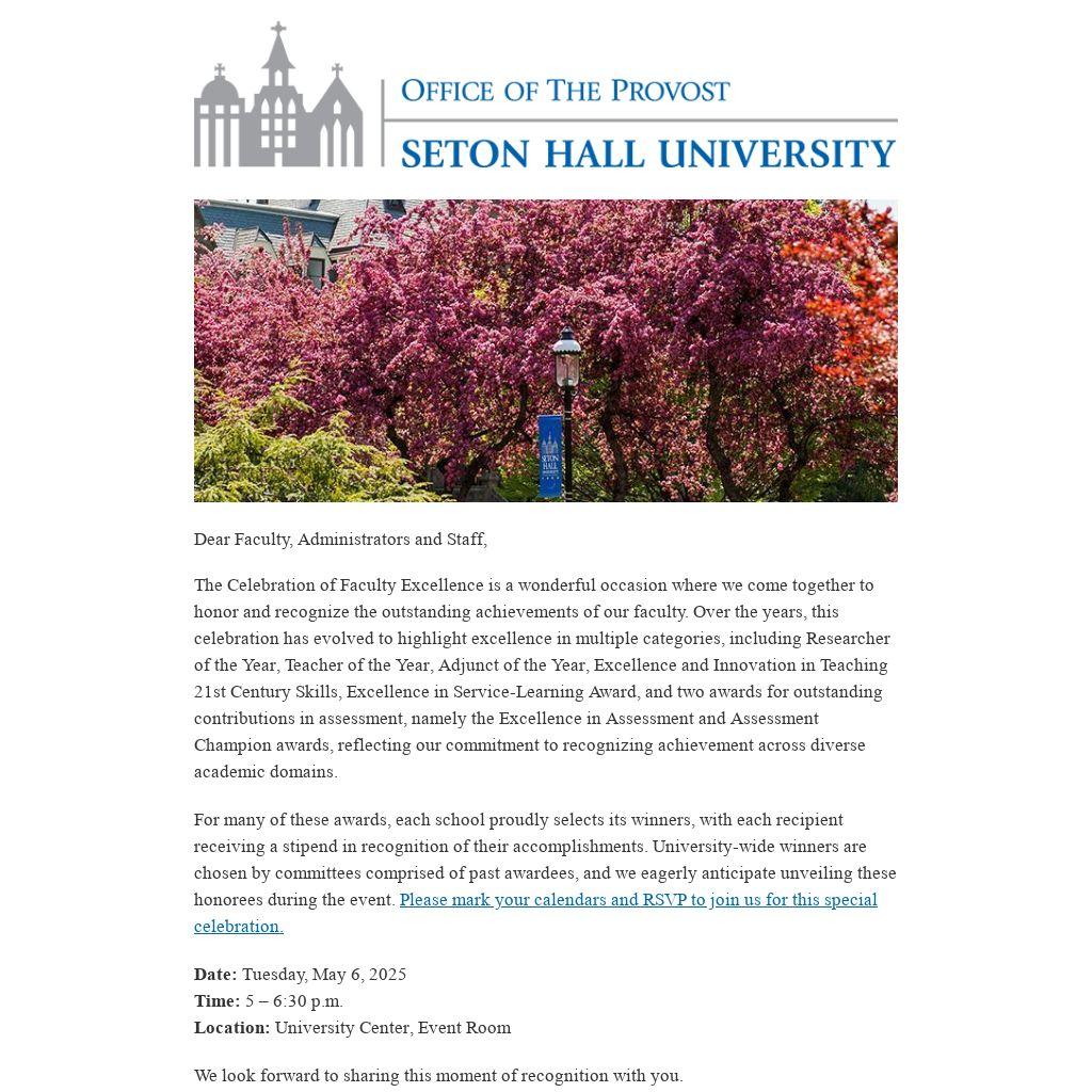 Our annual Charter Day celebration will be held on Tuesday, April 8, 2025 at 3 p.m. in the University Center. This special day honors Seton Hall’s founding, our Catholic mission and the legacy of our patroness, Saint Elizabeth Ann Seton, whose resilience and life continues to inspire us in so many ways. During the commemoration, we will recognize distinguished members of our community with the Bishop Bernard J. McQuaid Medal for Distinguished Service, the President’s Award for Student Service and honor our Servant Leader Scholars. And, to help bring Saint Elizabeth Ann Seton’s story to life, we’ll also welcome keynote speaker Catherine O’Donnell, Ph.D., author of Elizabeth Ann Seton: American Saint. Explore the full Schedule of Events on the Charter Day website and save your seat for the ceremony.