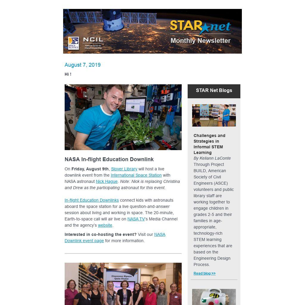The STAR Library Network (STAR Net) is a hands-on learning network for libraries and their communities across the country. STAR Net focuses on helping library professionals build their STEM skills by providing “science-technology activities and resources” (STAR) and training to use those resources. Plus, engage public audiences nationwide in informal and lifelong learning with the excitement of exploration and discovery through STAR Net's NASA@ My Library program!