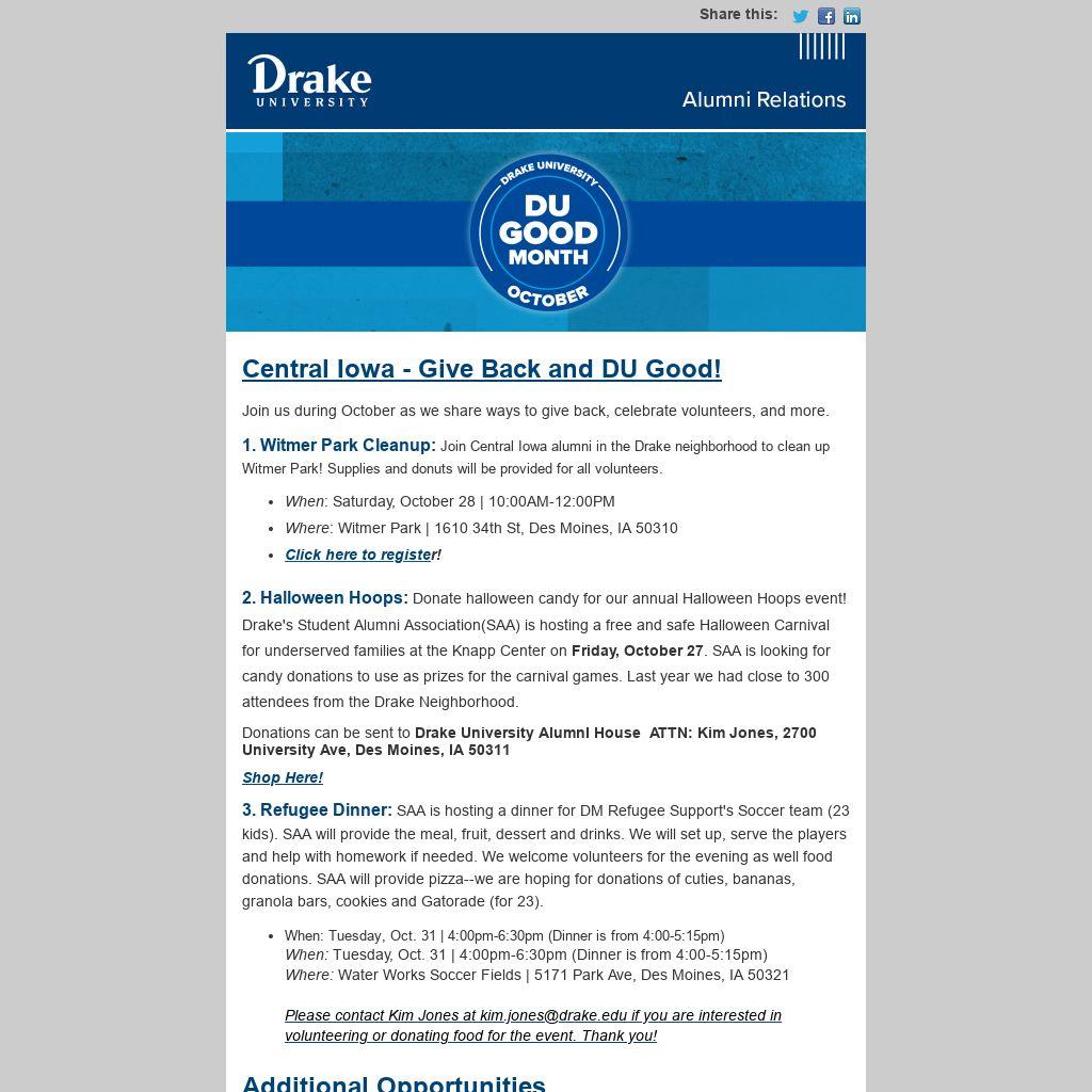 2. Celebrate Bulldog Volunteers: We're recognizing volunteers in the Drake community next month. Read their inspiring stories.