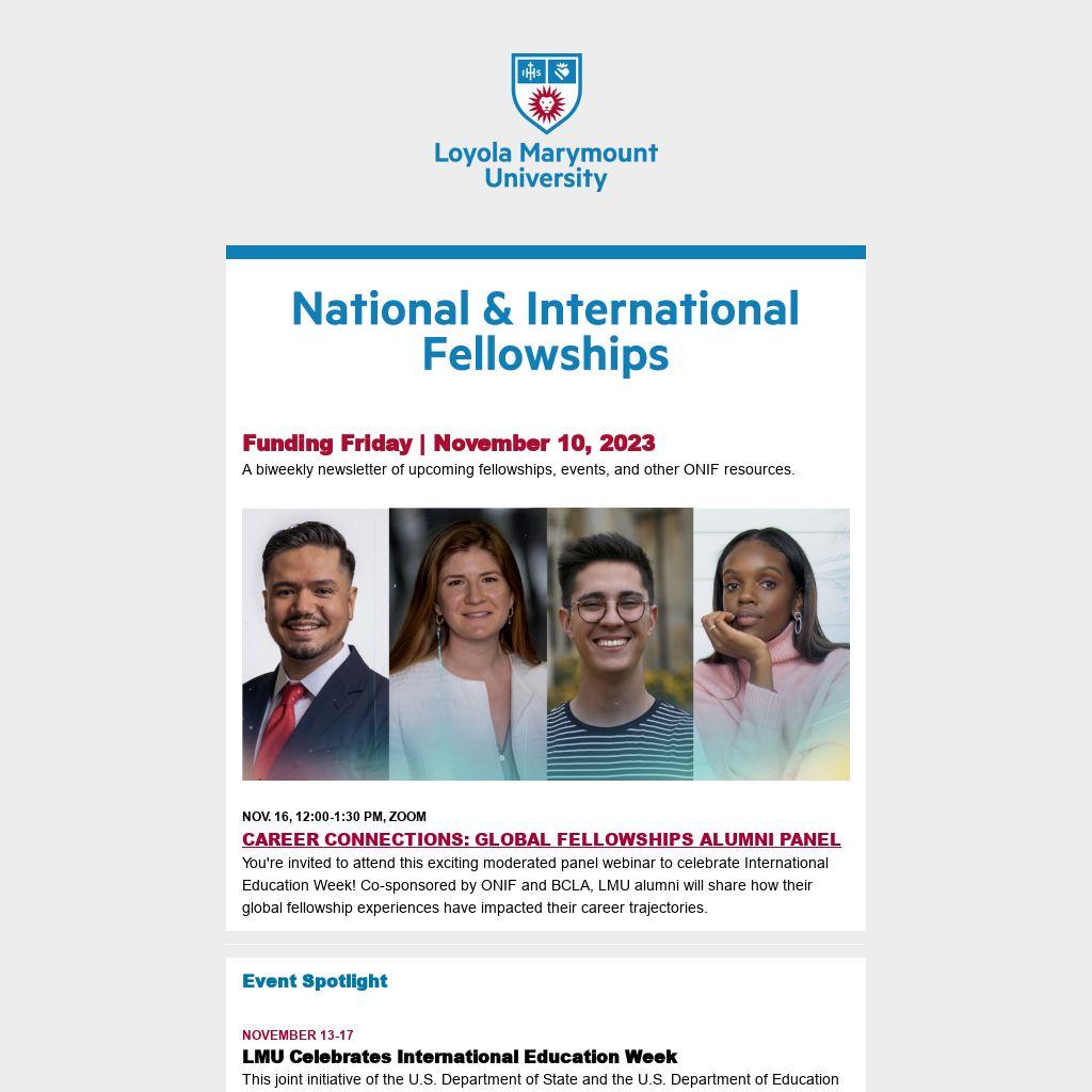 You're invited to attend this exciting moderated panel webinar to celebrate International Education Week! Co-sponsored by ONIF and BCLA, LMU alumni will share how their global fellowship experiences have impacted their career trajectories.