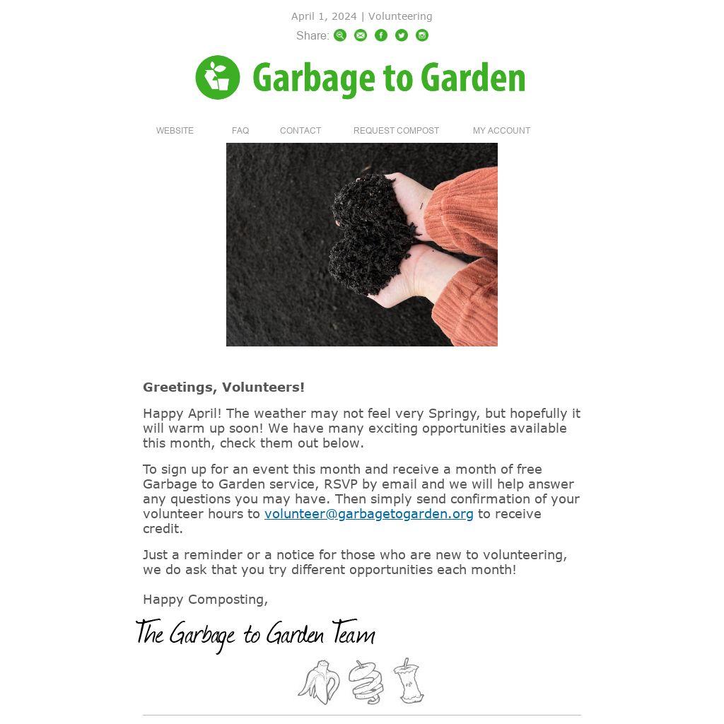 To sign up for an event this month and receive a month of free Garbage to Garden service, RSVP by email and we will help answer any questions you may have. Then simply send confirmation of your volunteer hours to volunteer@garbagetogarden.org to receive credit.