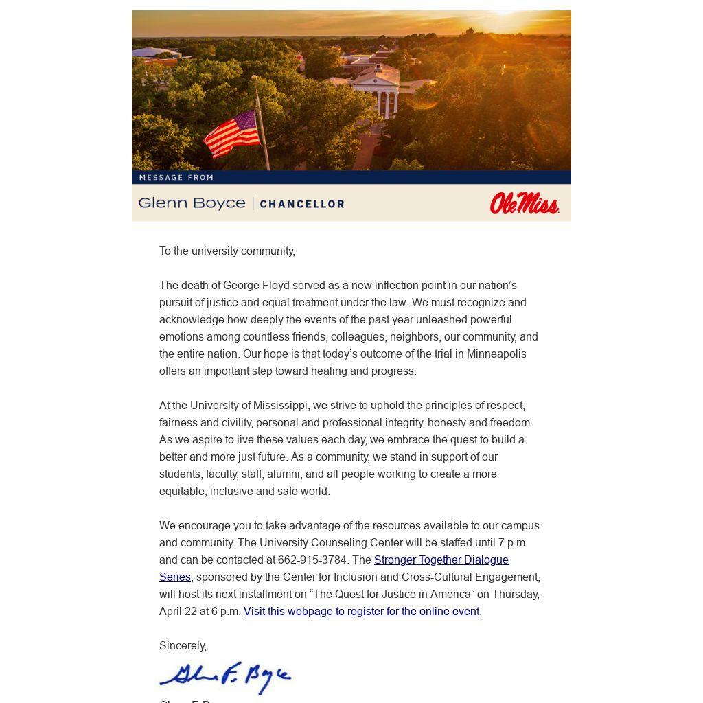We encourage you to take advantage of the resources available to our campus and community. The University Counseling Center will be staffed until 7 p.m. and can be contacted at 662-915-3784. The Stronger Together Dialogue Series, sponsored by the Center for Inclusion and Cross-Cultural Engagement, will host its next installment on “The Quest for Justice in America” on Thursday, April 22 at 6 p.m. Visit this webpage to register for the online event.