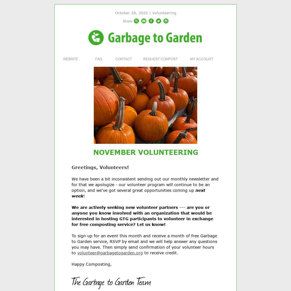 To sign up for an event this month and receive a month of free Garbage to Garden service, RSVP by email and we will help answer any questions you may have. Then simply send confirmation of your volunteer hours to volunteer@garbagetogarden.org to receive credit.