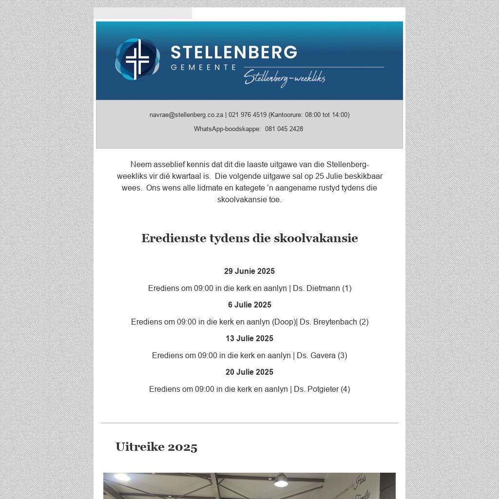 Neem asseblief kennis dat dit die laaste uitgawe van die Stellenberg-weekliks vir dié kwartaal is. Die volgende uitgawe sal op 25 Julie beskikbaar wees. Ons wens alle lidmate en kategete ’n aangename rustyd tydens die skoolvakansie toe.