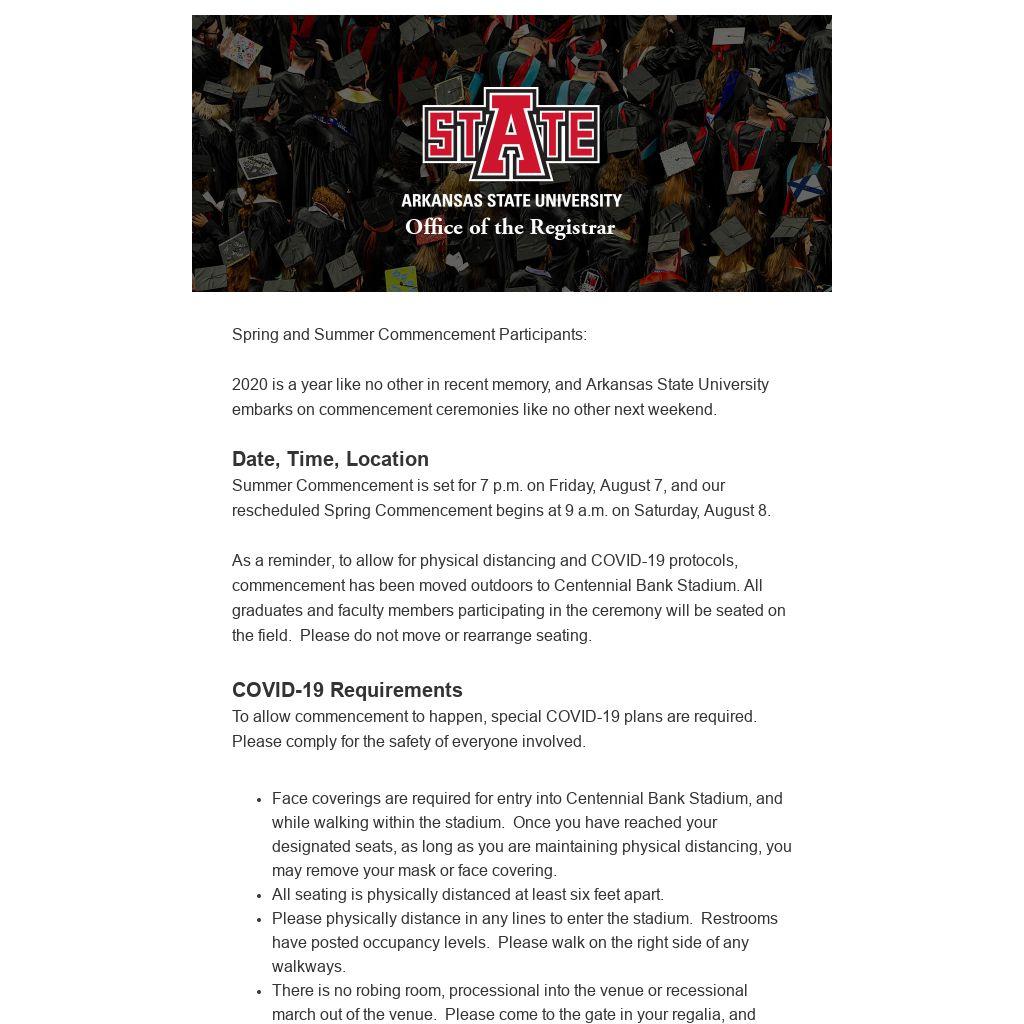 | Inclement Weather Policy In the event of severe storms or lightning, the standard A-State weather protocols for outdoor events will be in place. Just like a football game, commencement will continue unless lightning is within the safety perimeter of the stadium. If it becomes necessary, commencement would be paused until a severe storm passed. If a sustained heavy or severe storm front is forecast, the emergency back-up plan will be to relocate the ceremony to the Student Activity Center. Due to the limited size of the SAC, only graduates will be allowed, but the ceremony will be live streamed for family to watch online.