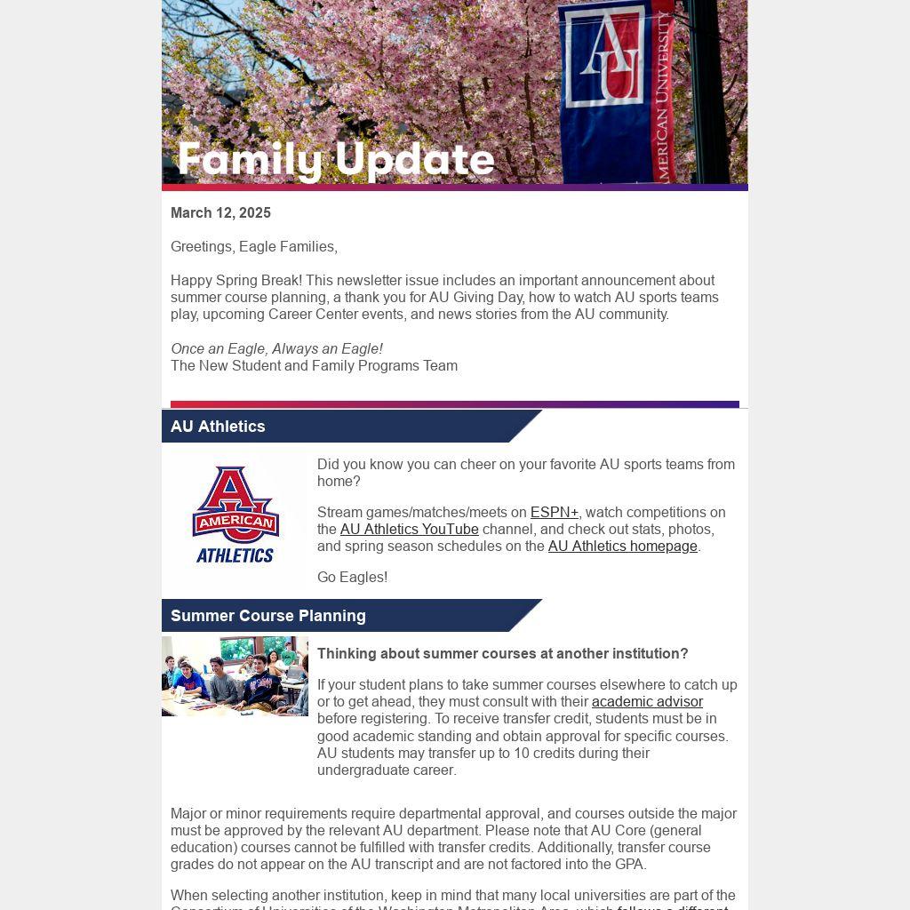 Happy Spring Break! This newsletter issue includes an important announcement about summer course planning, a thank you for AU Giving Day, how to watch AU sports teams play, upcoming Career Center events, and news stories from the AU community.