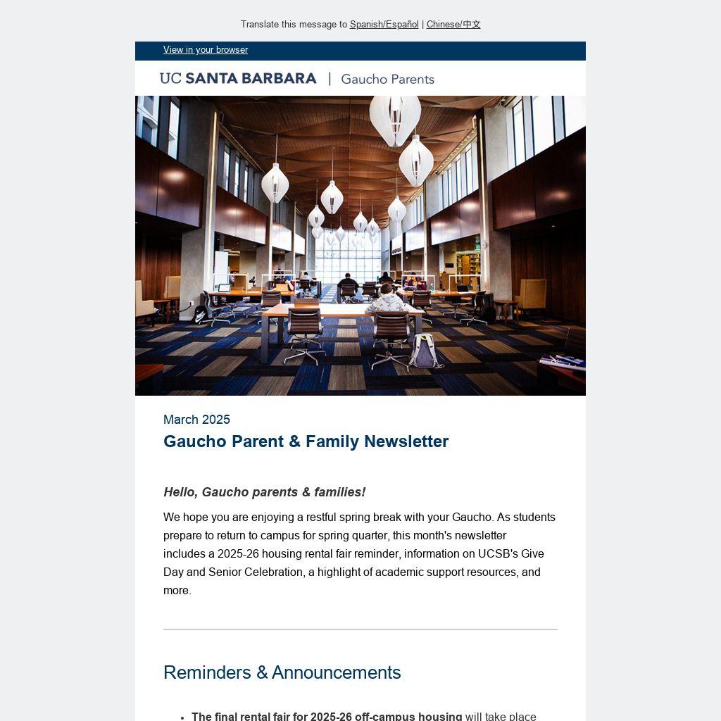 We hope you are enjoying a restful spring break with your Gaucho. As students prepare to return to campus for spring quarter, this month's newsletter includes a 2025-26 housing rental fair reminder, information on UCSB's Give Day and Senior Celebration, a highlight of academic support resources, and more.