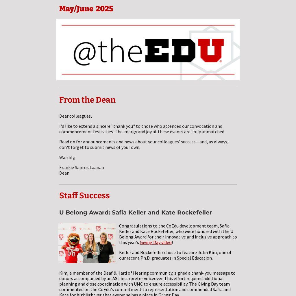 Congratulations to the CoEdu development team, Safia Keller and Kate Rockefeller, who were honored with the U Belong Award for their innovative and inclusive approach to this year’s Giving Day video!