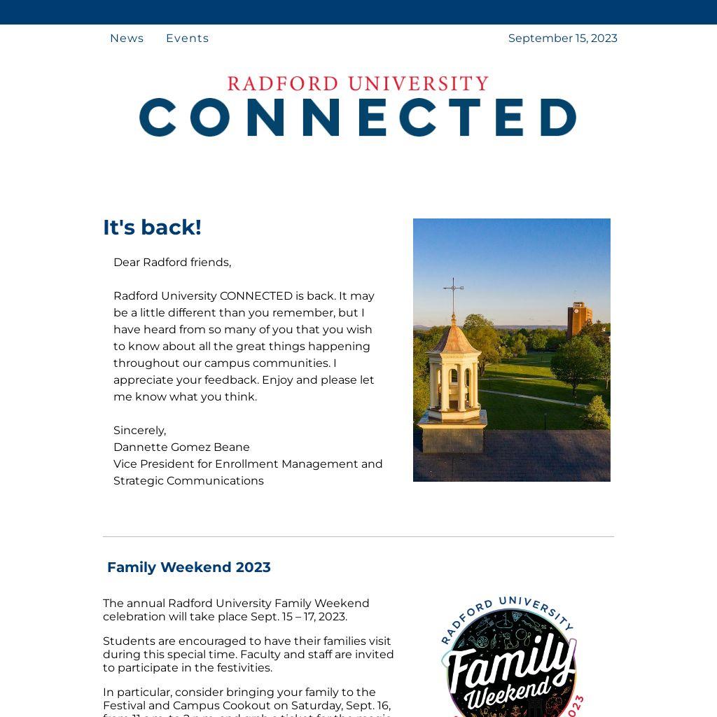 Radford University CONNECTED is back. It may be a little different than you remember, but I have heard from so many of you that you wish to know about all the great things happening throughout our campus communities. I appreciate your feedback. Enjoy and please let me know what you think.