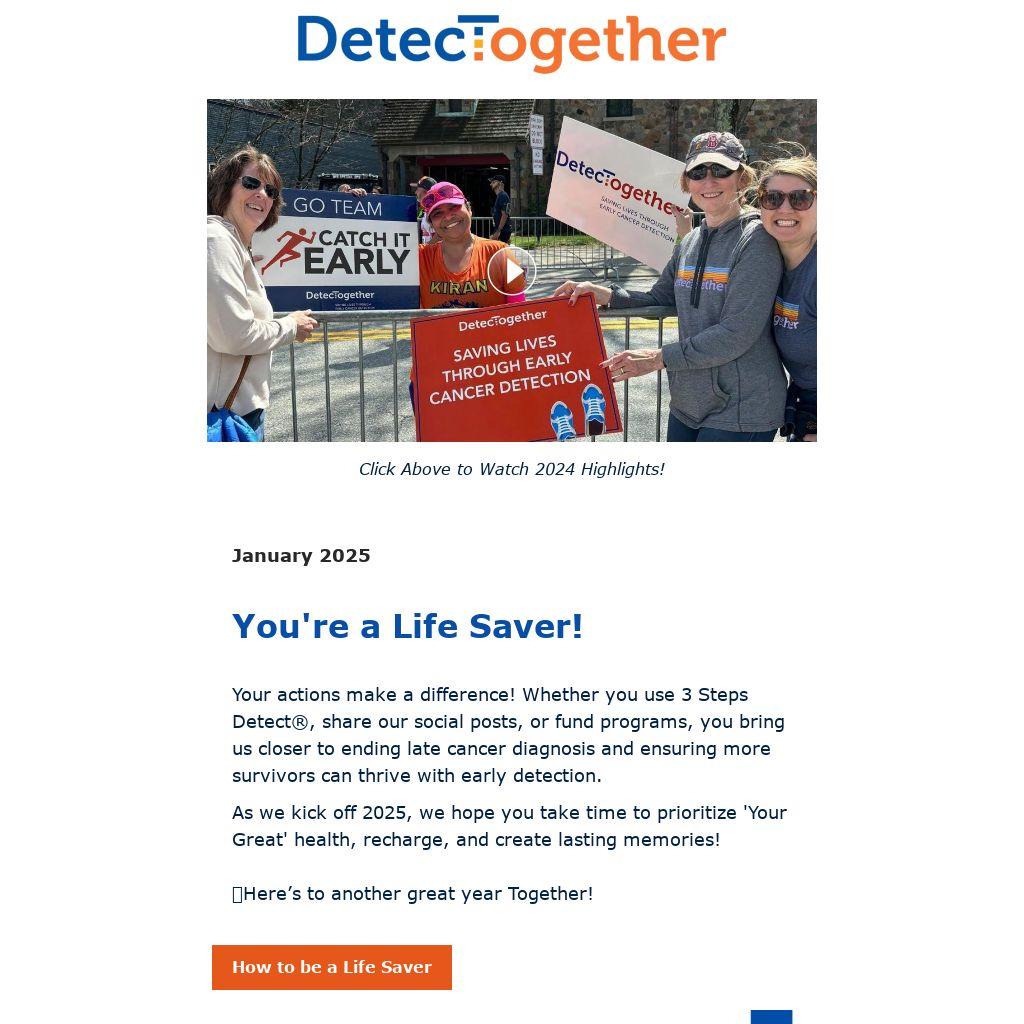 Your actions make a difference! Whether you use 3 Steps Detect®, share our social posts, or fund programs, you bring us closer to ending late cancer diagnosis and ensuring more survivors can thrive with early detection.