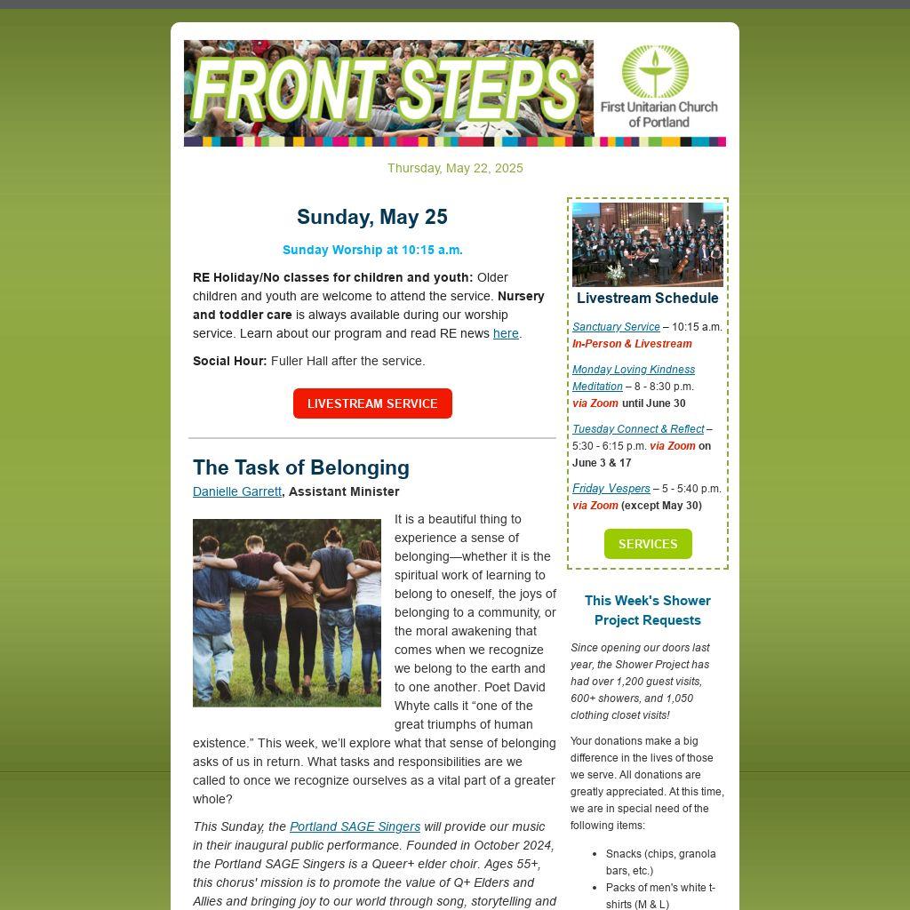 As we move towards the end of our third year of shared ministries here at First Unitarian Portland, I am conscious of all the ways that 2024 â 2025 has been filled with renewal, inspiration, and commitment.