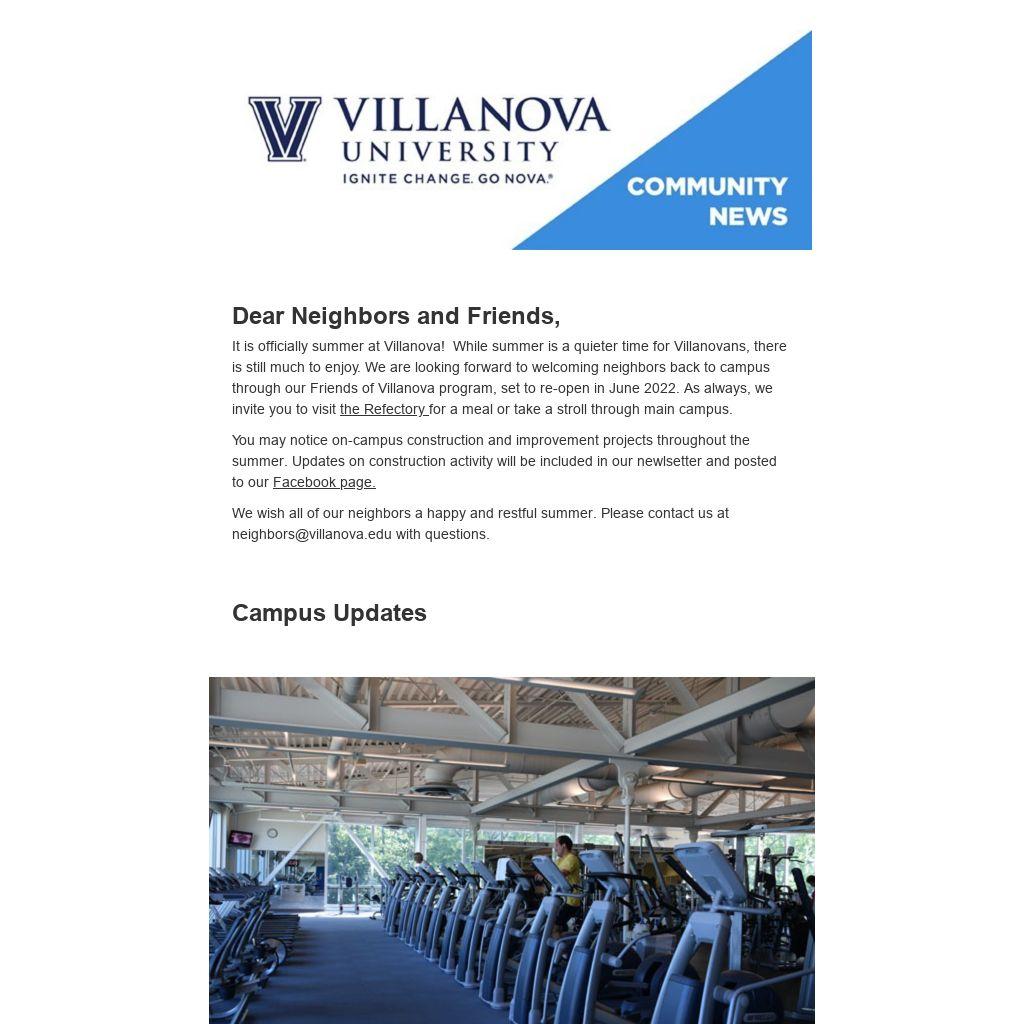 As a reminder, the Friends of Villanova program provides access to designated University facilities and programs for residents of Radnor Township and select neighborhoods in Lower Merion Township that are contiguous to campus. Members must be 18 years of age or older. The highlight of the program is access to the fitness center in the Davis Center for Athletics and Fitness—and group exercise classes that take place in the Davis Center—on a space-available basis when campus is open.