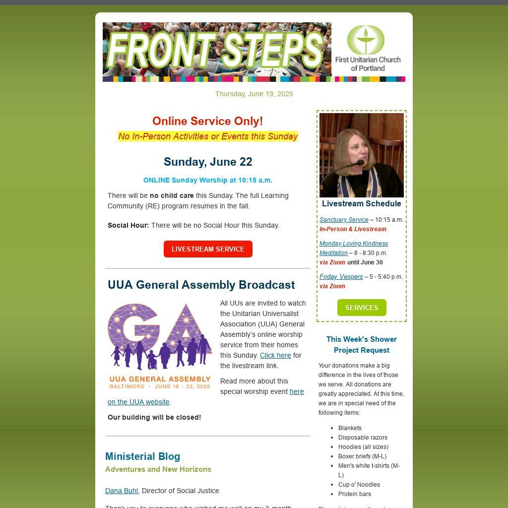 Beginning this Sunday, First Unitarian Portland will be on our summer schedule! Sunday worship services continue at 10:15 a.m. followed by social hour, a few new offerings will appear, and some groups and activities will pause until the new church program year begins in September.