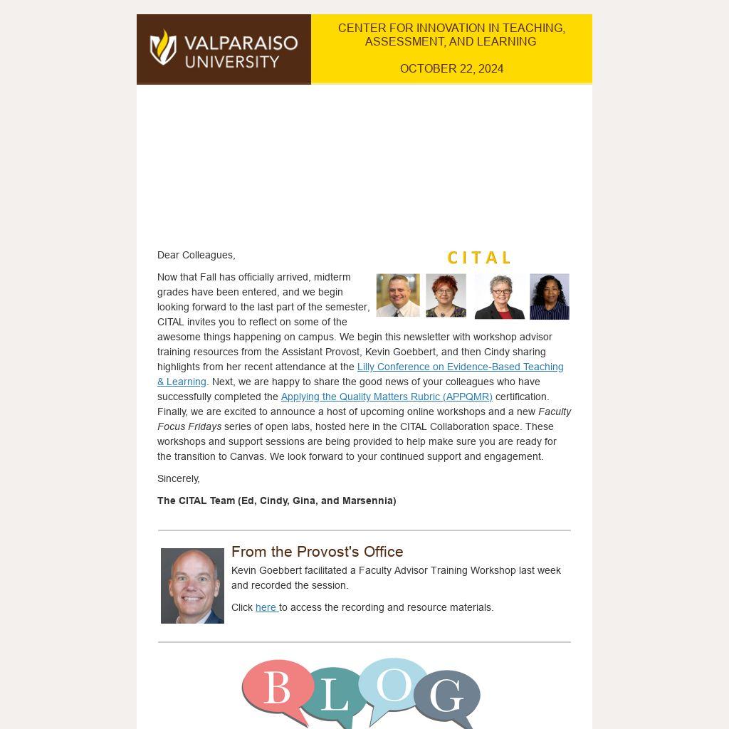 Now that Fall has officially arrived, midterm grades have been entered, and we begin looking forward to the last part of the semester, CITAL invites you to reflect on some of the awesome things happening on campus. We begin this newsletter with workshop advisor training resources from the Assistant Provost, Kevin Goebbert, and then Cindy sharing highlights from her recent attendance at the