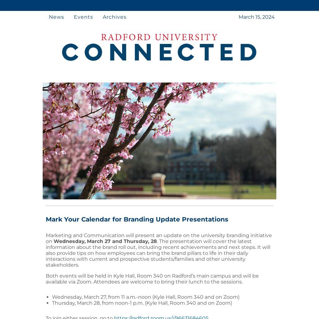 Marketing and Communication will present an update on the university branding initiative on Wednesday, March 27 and Thursday, 28. The presentation will cover the latest information about the brand roll out, including recent achievements and next steps. It will also provide tips on how employees can bring the brand pillars to life in their daily interactions with current and prospective students/families and other university stakeholders.