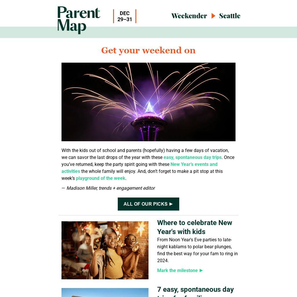 With the kids out of school and parents (hopefully) having a few days of vacation, we can savor the last drops of the year with these easy, spontaneous day trips. Once you’ve returned, keep the party spirit going with these New Year’s events and activities the whole family will enjoy. And, don’t forget to make a pit stop at this week’s playground of the week.