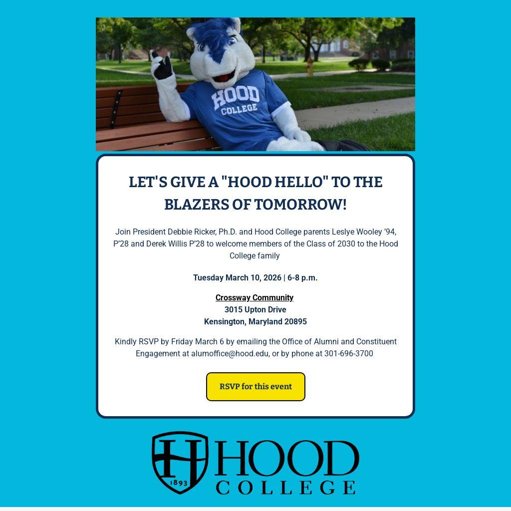 Kindly RSVP by Friday March 6 by emailing the Office of Alumni and Constituent Engagement at alumoffice@hood.edu, or by phone at 301-696-3700