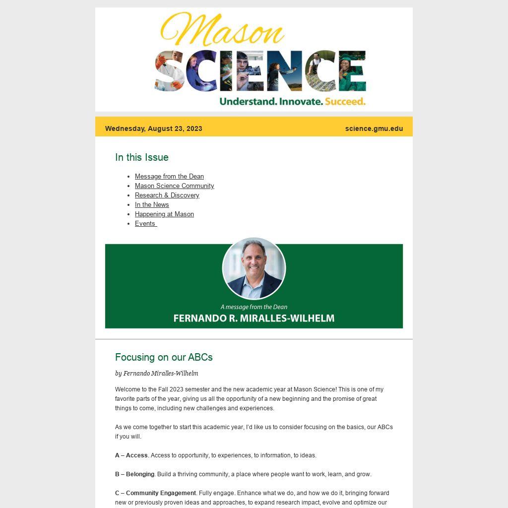 Welcome to the Fall 2023 semester and the new academic year at Mason Science! This is one of my favorite parts of the year, giving us all the opportunity of a new beginning and the promise of great things to come, including new challenges and experiences.