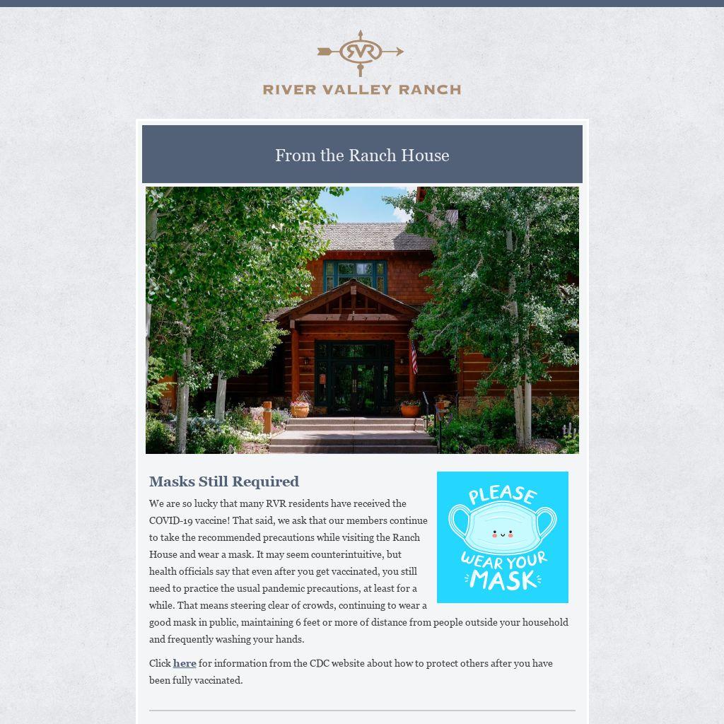 We are so lucky that many RVR residents have received the COVID-19 vaccine! That said, we ask that our members continue to take the recommended precautions while visiting the Ranch House and wear a mask. It may seem counterintuitive, but health officials say that even after you get vaccinated, you still need to practice the usual pandemic precautions, at least for a while. That means steering clear of crowds, continuing to wear a good mask in public, maintaining 6 feet or more of distance from people outside your household and frequently washing your hands.