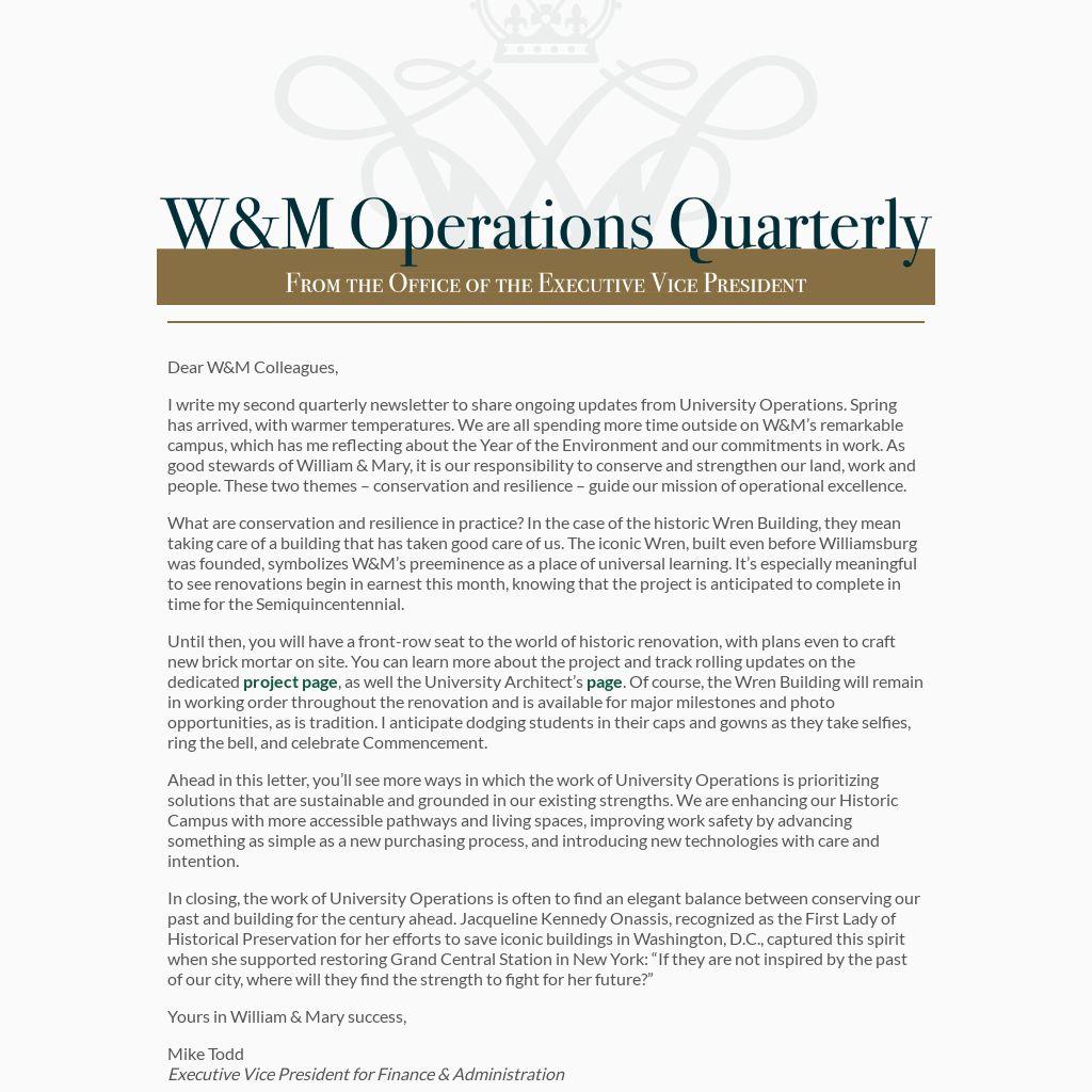 I write my second quarterly newsletter to share ongoing updates from University Operations. Spring has arrived, with warmer temperatures. We are all spending more time outside on W&M’s remarkable campus, which has me reflecting about the Year of the Environment and our commitments in work. As good stewards of William & Mary, it is our responsibility to conserve and strengthen our land, work and people. These two themes – conservation and resilience – guide our mission of operational excellence.