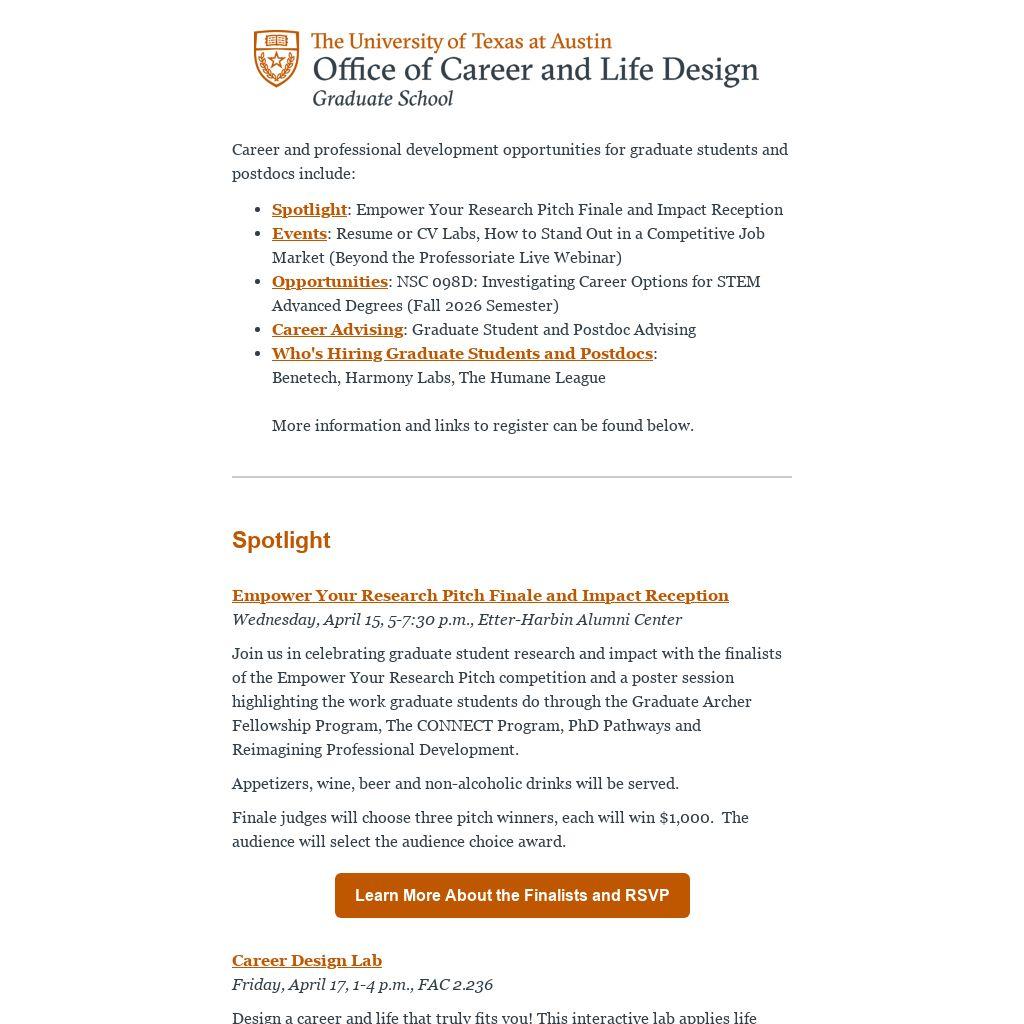 Graduate Job Search Working Group Wednesdays during April, 11 a.m.-noon, FAC 2.138 or Virtual See the full list of weekly themes on 12twenty!
