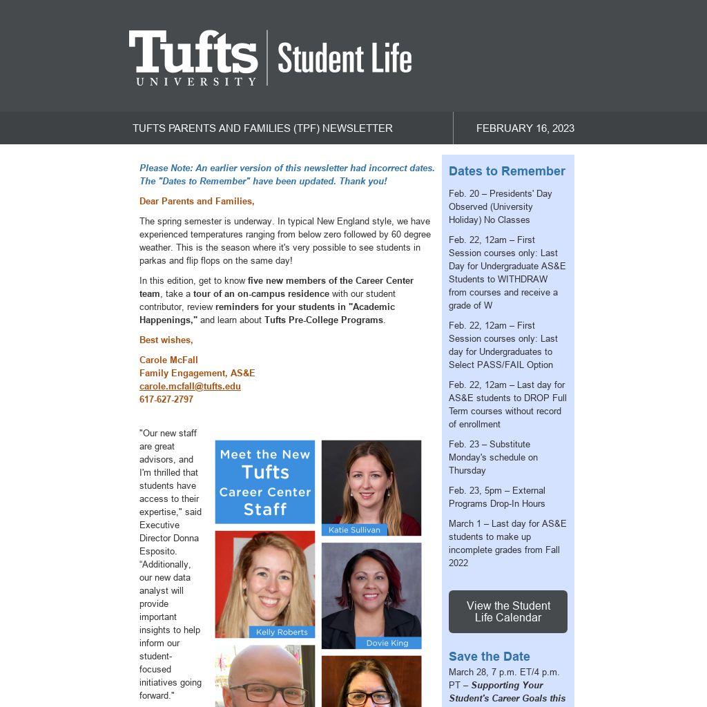 Katie: Making career decisions in college can be stressful. Remind your student that finding a meaningful career is not a treasure hunt for one perfect job; it’s a process of reflecting and gaining new experiences. Given the number of times most people change jobs and even industries throughout their lives, we’re hoping to teach our students strategies and processes that they will continue to use well past their time at Tufts.