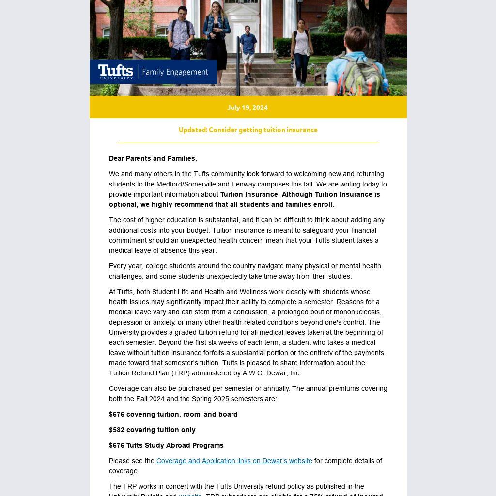 We and many others in the Tufts community look forward to welcoming new and returning students to the Medford/Somerville and Fenway campuses this fall. We are writing today to provide important information about Tuition Insurance. Although Tuition Insurance is optional, we highly recommend that all students and families enroll.