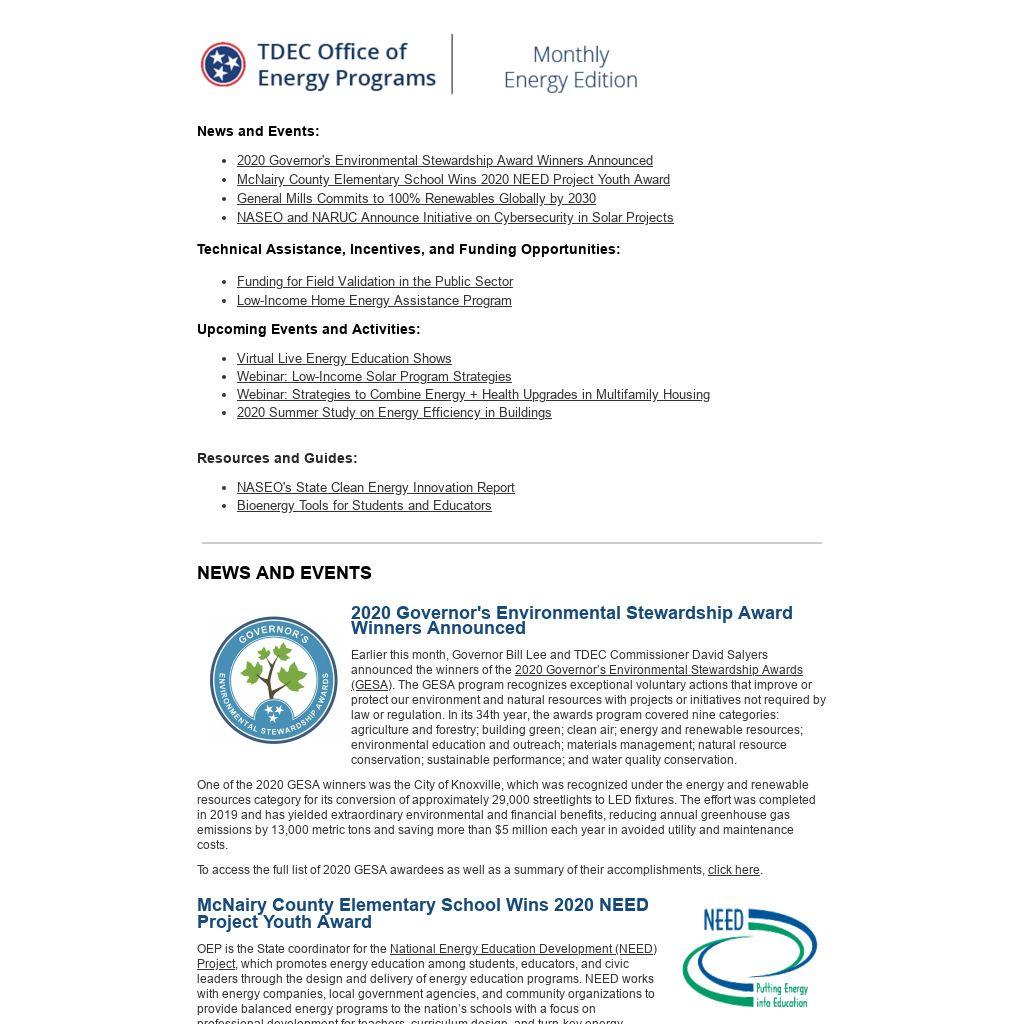 The report highlights the need for State Energy Offices to pursue models that promote coordination and communication among stakeholders. As an example, the reports notes that TDEC OEP supports clean energy technology investment in Tennessee through its participation in the Tennessee Advanced Energy Business Council (TAEBC). TDEC OEP's involvement in TAEBC helps to connect, educate, and promote partnerships among business leaders and public officials to foster the growth of advanced energy technologies, companies, and jobs within the state.