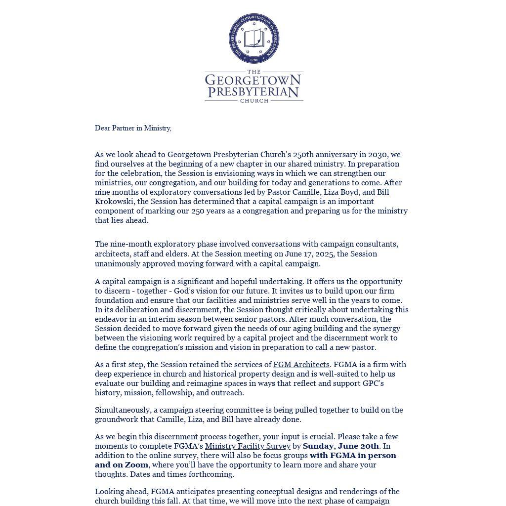 As we look ahead to Georgetown Presbyterian Church’s 250th anniversary in 2030, we find ourselves at the beginning of a new chapter in our shared ministry. In preparation for the celebration, the Session is envisioning ways in which we can strengthen our ministries, our congregation, and our building for today and generations to come. After nine months of exploratory conversations led by Pastor Camille, Liza Boyd, and Bill Krokowski, the Session has determined that a capital campaign is an important component of marking our 250 years as a congregation and preparing us for the ministry that lies ahead.