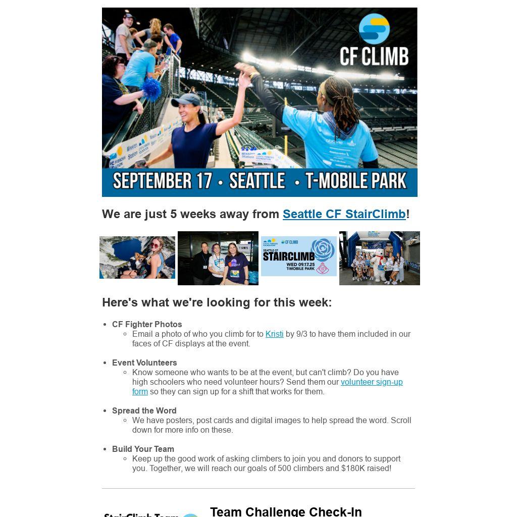 - Email a photo of who you climb for to Kristi by 9/3 to have them included in our faces of CF displays at the event.