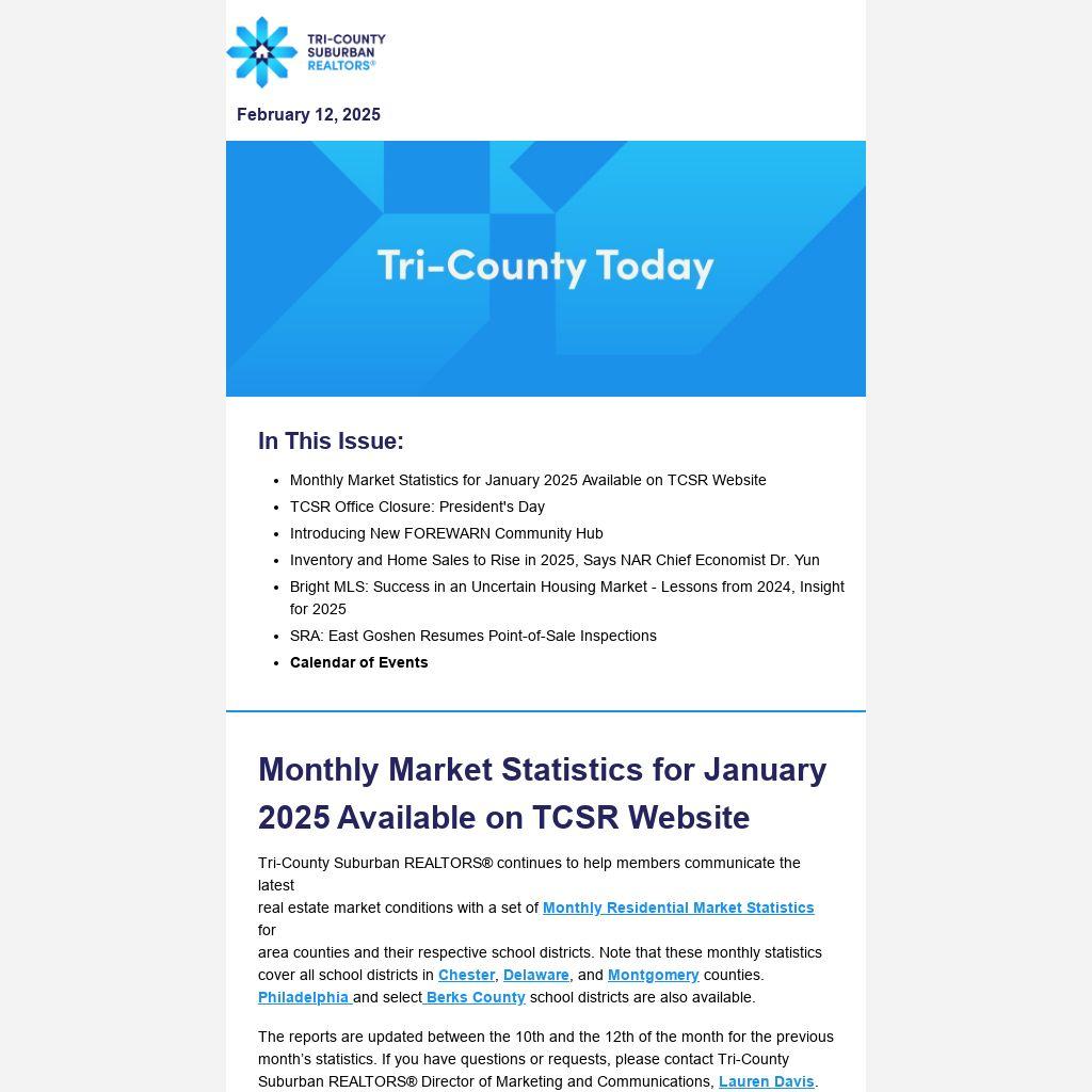 - Monthly Market Statistics for January 2025 Available on TCSR Website