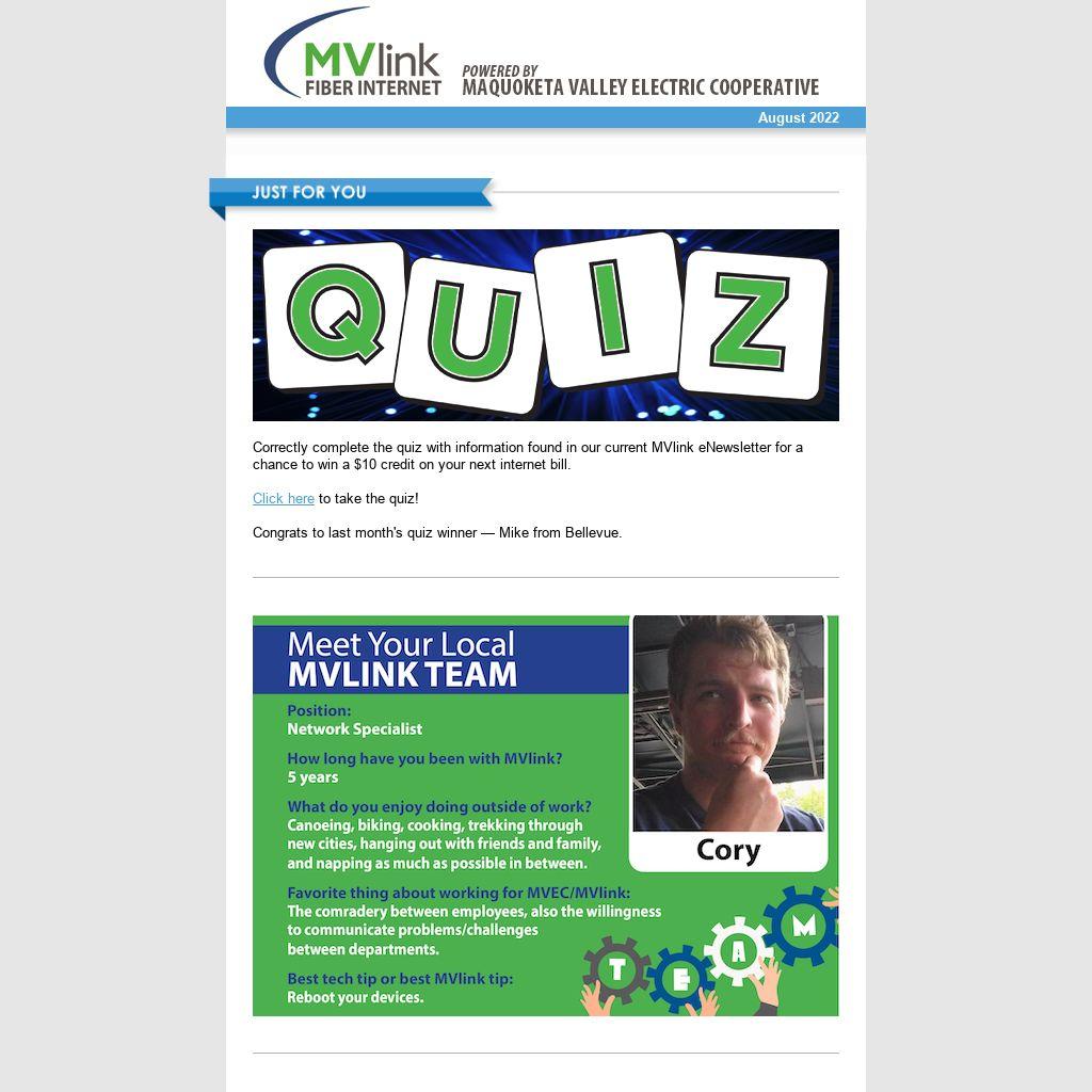 Correctly complete the quiz with information found in our current MVlink eNewsletter for a chance to win a $10 credit on your next internet bill. Click here to take the quiz! Congrats to last month's quiz winner — Mike from Bellevue. ![]()