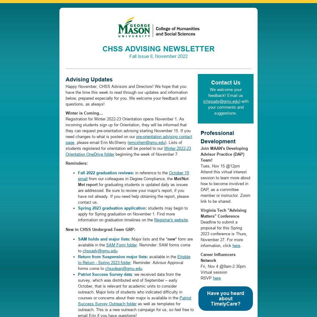 I feel like a Mason “time traveler.” I started my graduate studies at Mason in 1992, and my first job at Mason was in 1994, with the team that started the Center for Global Education (housed in a trailer at the time, in a large parking lot where Merten Hall now sits…). I left Mason in 1997 after finishing my graduate program and returned to Mason study abroad in 2014. It was amazing to see how much Mason had grown and expanded in just under 20 years. Following that position, I worked as an undergraduate academic advisor in Criminology, and in Government and International Politics. I joined the Economics Undergraduate Advising Team in 2019, where I continue to support and guide our students, and work with my colleagues in the Mason Advising community, with ECON staff and faculty, as well as with CHSS staff.