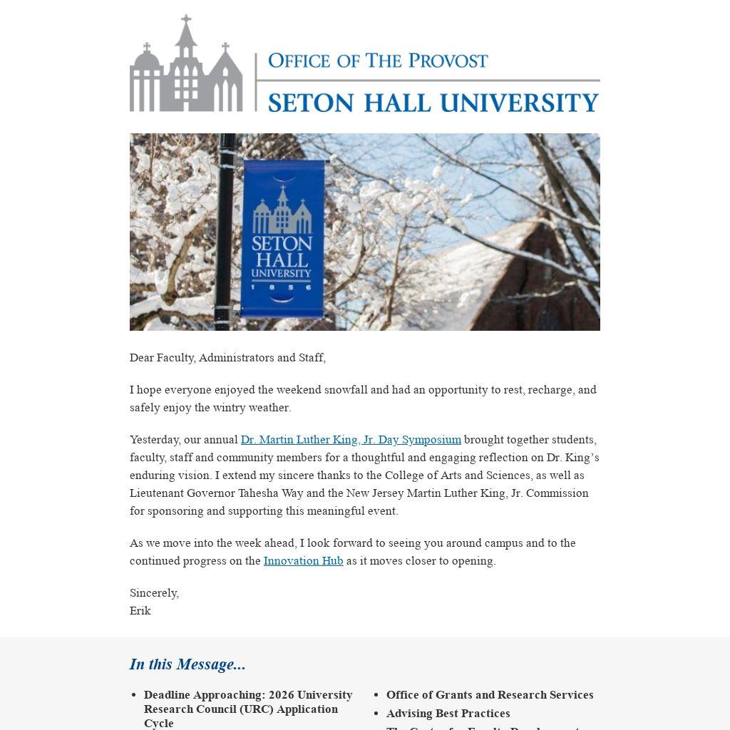 Yesterday, our annual Dr. Martin Luther King, Jr. Day Symposium brought together students, faculty, staff and community members for a thoughtful and engaging reflection on Dr. King’s enduring vision. I extend my sincere thanks to the College of Arts and Sciences, as well as Lieutenant Governor Tahesha Way and the New Jersey Martin Luther King, Jr. Commission for sponsoring and supporting this meaningful event.
