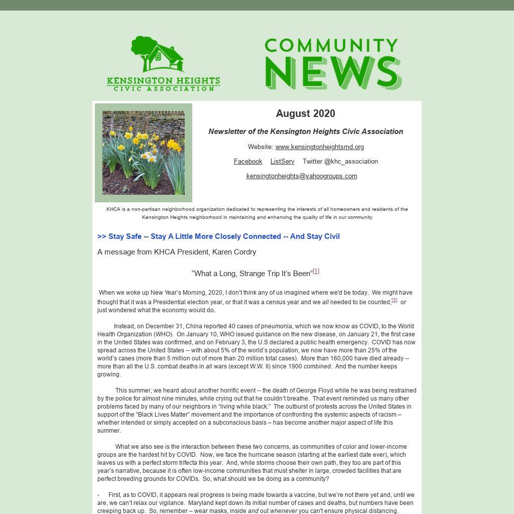 We are also working on updating our membership directory and block captain list. If you'd be willing to be captain for your block (and help us get a full update for our directory of our current KHCA neighbors), and/or to join us on the Executive Committee to help keep KHCA vibrant and functioning, just let Karen Cordry know. Click here to email her.
